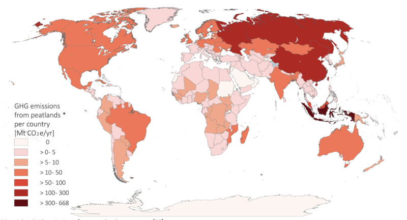 La carte présente, pour chaque pays, la quantité d’émissions de gaz à effet de serre provenant des tourbières. Ces émissions sont calculées sur la base des superficies de tourbières drainées utilisées pour la foresterie, l’agriculture ou l’extraction de la tourbe, en appliquant les facteurs d’émission établis par le GIEC (Groupe d’experts intergouvernemental sur l’évolution du climat). Crédit : Global Peatland Hotspot Atlas, PNUE 2024