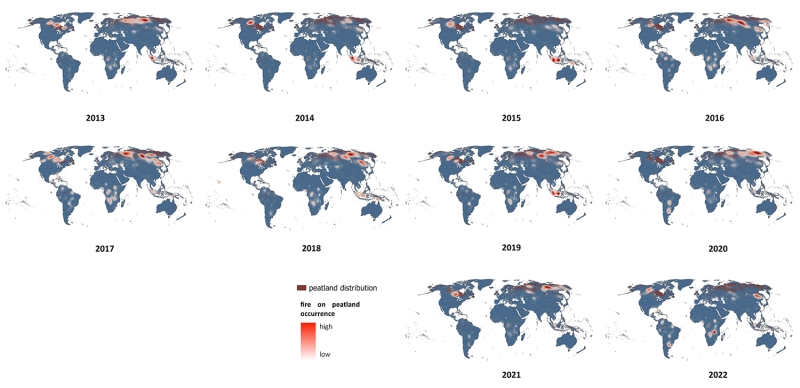 La carte présente les principaux foyers d’incendie dans les tourbières entre 2013 et 2022, tout en indiquant la présence des phénomènes climatiques La Niña et El Niño. Crédit : Global Peatland Hotspot Atlas, PNUE 2024