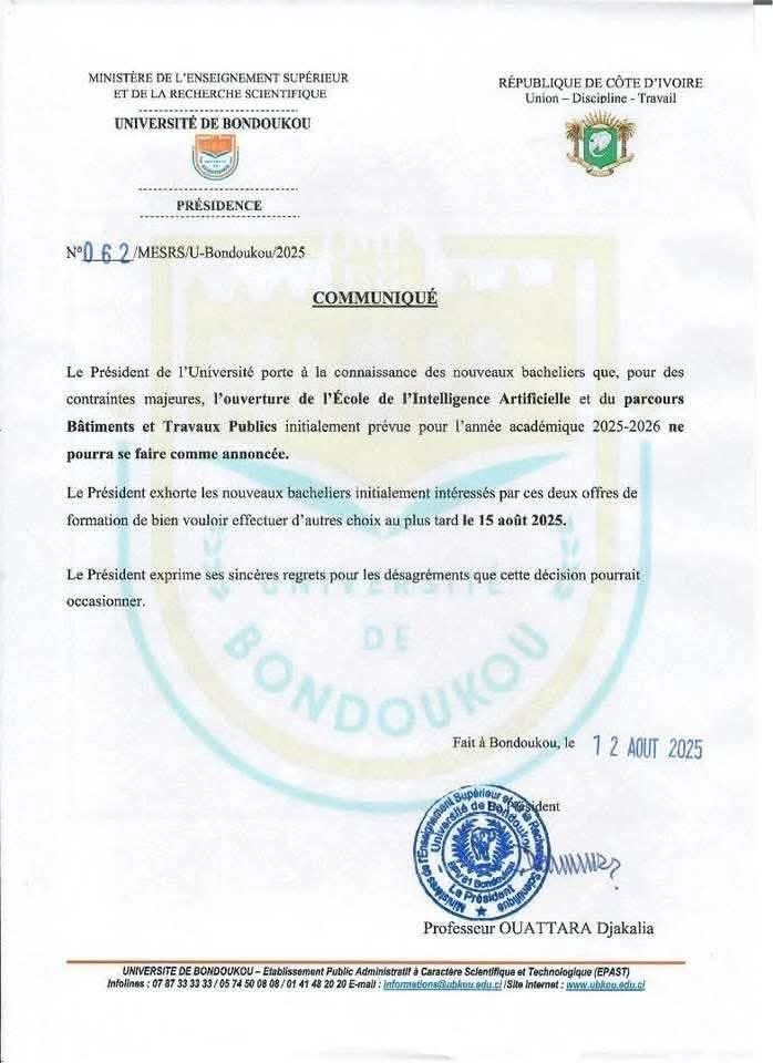 L’Université de Bondoukou ne lancera finalement pas, comme prévu, l’École de l’Intelligence Artificielle et le parcours Bâtiments et Travaux Publics (BTP) à la rentrée académique 2025-2026, a annoncé mardi sa présidence dans un communiqué.