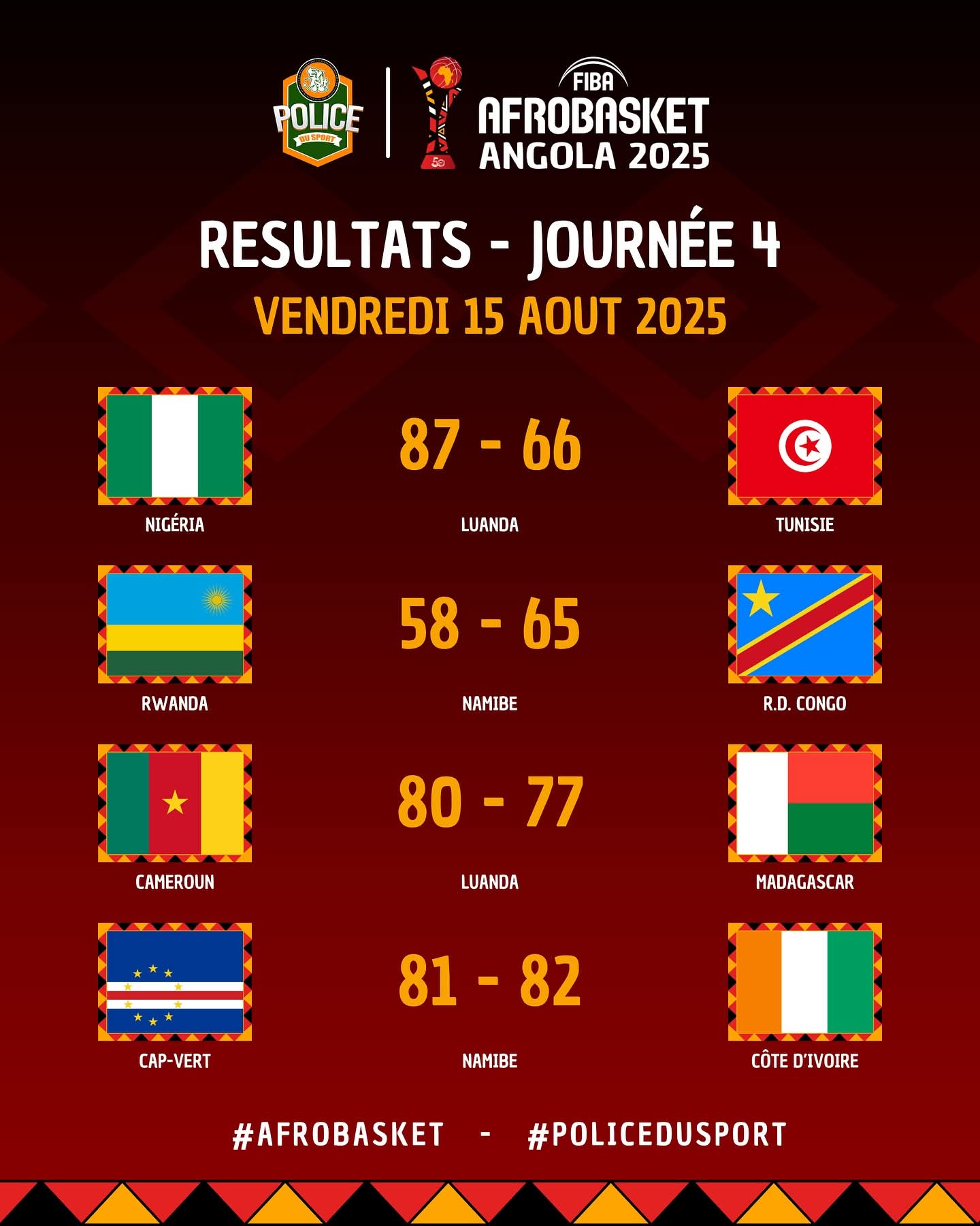 Dans les autres rencontres de la journée, le Nigeria a largement dominé la Tunisie (87-66) à Luanda, confirmant ses ambitions dans la compétition.