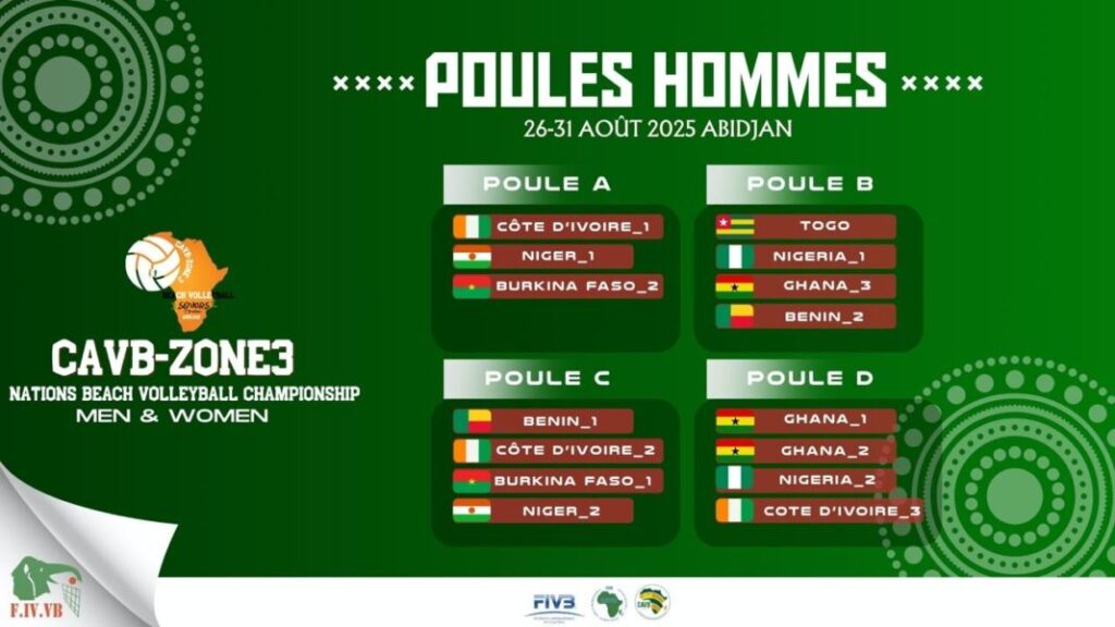 La Coupe des Nations de beach-volleyball de la Zone 3 de la Confédération africaine de volleyball (CAVB) se tient à Abidjan en Côte d’Ivoire du 26 au 30 août 2025. Cet événement, qui réunit les sélections masculines et féminines de la sous-région ouest-africaine, s’annonce comme un rendez-vous majeur pour la discipline, mêlant intensité sportive, rivalités régionales et ambitions internationales.