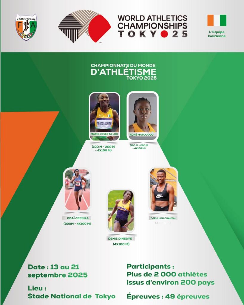 Actu Sports Côte d’Ivoire, Mondiaux Tokyo 2025 Lebeni Koffi 11 septembre 2025 0 Commentaires Mondiaux Tokyo 2025-Côte d’Ivoire: Bonne chance les filles !