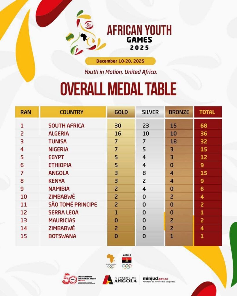 L’Afrique du Sud s’est imposée comme la grande puissance sportive des Jeux africains de la jeunesse 2025, organisés à Luanda du 10 au 20 décembre, en terminant largement en tête du tableau général des médailles, selon le classement officiel publié à l’issue de la compétition.